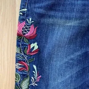Cute jeans, variegated color, assume that is the way it was when new, I got second hand. Some stretch. Very cool embroidery down the side of the legs. Inseam 25 inches. Rise 9 inches.