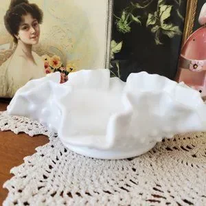 Pretty, crisp White Fenton milk glass Hobnail dish with a ruffled rim.