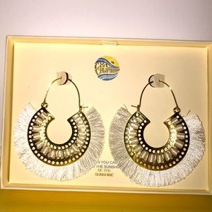 This pair of fashionable earrings make quite an impression with its white fringe! New, in box, and ready to flirt up any outfit from swimsuit to dress and everything in between