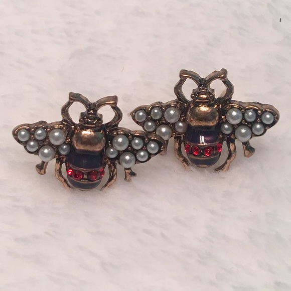 Rhinestone pearl bee antique gold vintage earrings boho Nwt