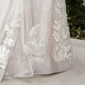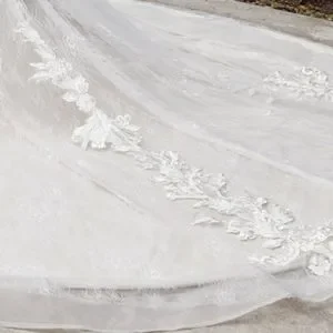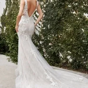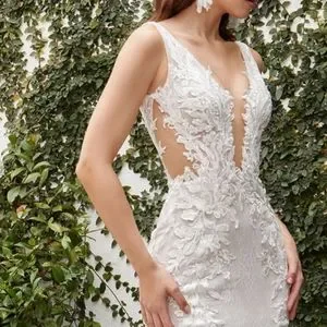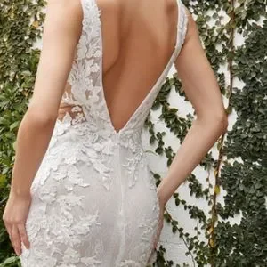 Mermaid lace gown .Floral lace on chantilly lace. V neckline, sheer side details.