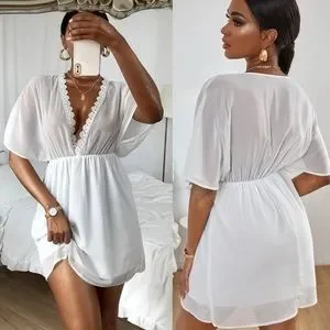 Boho gypsy v neck scalloped lace sheer swim coverup beach white