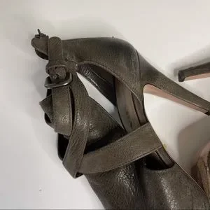 Style: Crossover Booties. Straps with Cutout Accents. Peep-Toes with Cone Heels with Platform. Buckle & Exposed Zip and Closures at Ankles.
