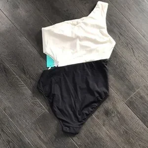 Super trendy one shoulder one piece. Cut out on the side. Very comfortable! Has bra cups! Cream and black
