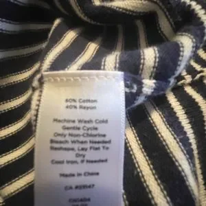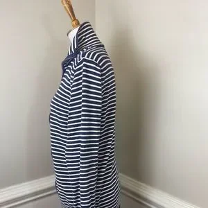 Medium weight cotton/rayon blend stretch knit fabric. Navy and white horizontal stripes throughout. Mock neck. Lightly burnished brass zip front closure. Navy trim on each side of zipper. Long sleeves with ribbed cuffs. Ribbed at bottom.