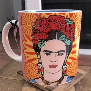 Vibrantly colored image of Frida Kahlo on one side with “Fierce like Frida” printed on the other
