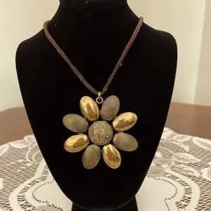 Flower-like pendant necklace on a brown leather cord features alternating shiny and brushed brass petals with a brown and beige marble-like stone in the center. Adjustable length between 17-20” Flower pendant is 2-1/4” in diameter. Great condition, rarely worn.