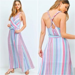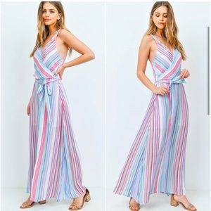 Details - V neck with twisted halter straps that cross in back, belted tie waist, lined to the knees