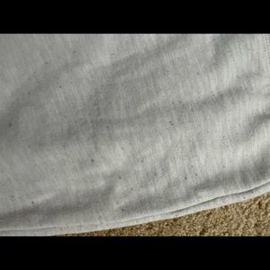 Size small. Tag worn off. Some piling with small stain on backside that would be covered if wearing a T-shirt or sweatshirt. Light grey color