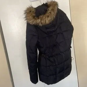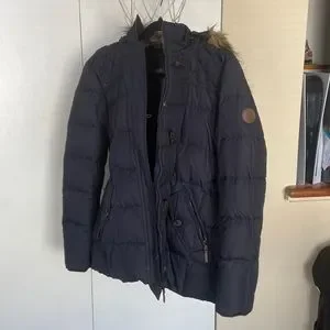 Navy blue short coat. Lightly used. SiZe large. Front zipper pockets. No stains no rips. Just don’t need this coat. Any questions please ask prior to purchasing. Smoke and pet free home.