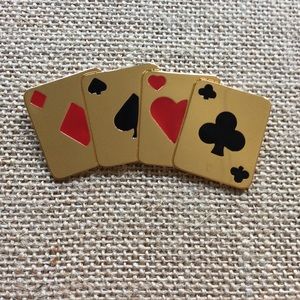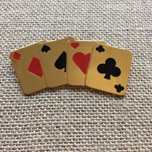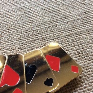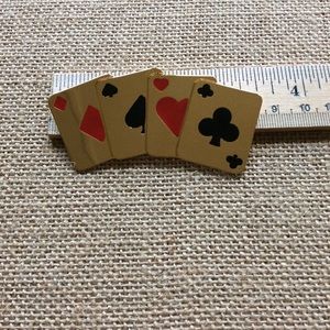 In a good used condition a suit of cards brooch. Gold-tone with a rollover clasp. The suits are enamel painted. It's not stamped & has a few faint scratches, which I've tried to show in the pictures. Questions welcome. Should not be worn at a Gamblers Anonymous meeting.