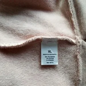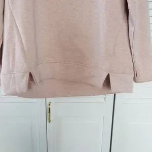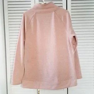 Lush soft pink sweatshirt with stand up side zip collar. Rose gold zipper. Banded hemline. Fabric of polyester, cotton and spandex. Size Large.