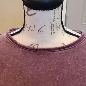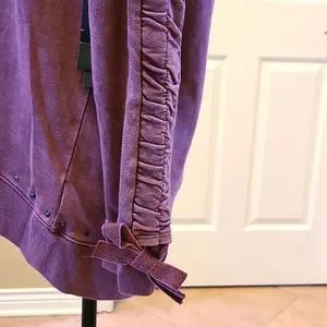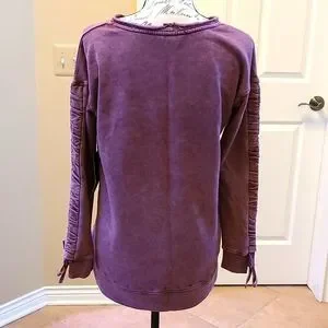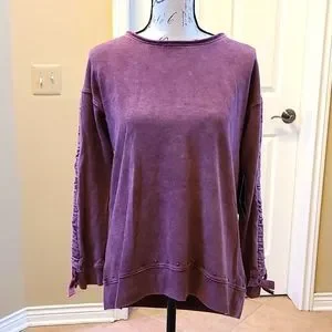 Womens Rock & Republic Sweatshirt with lace and tie down the arm and embellishments around the waist. Size Large. Color is like a mix between a worn purple/ burgundy. Very cool sweatshirt to dress up or down. Excellent condition.