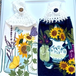 Two beautiful handmade sunflowers birds and butterflies crocheted top hanging kitchen dish or bathroom hand towels Towels are Kohl’s Celebrate Fall collection