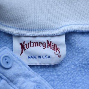 that tarheel blue looks so good on this piece. nutmeg mills is known for their collars and stripes. two white strips running along the sleeves and toros even in the back. nice big unc screen print on the front. excellent condition; no noticeable flaws, light vintage wear.