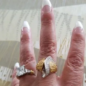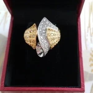 Gorgeous Ribbon style two-toned 18kt White and Yellow Gold Ladies Ring. Set with 56 round Yellow Diamonds (.64ct) and 27 round White Diamonds (.35ct). One full carat total diamond weight. Approximately size 7, but sizable. Pictures don't do it justice!