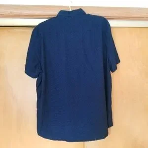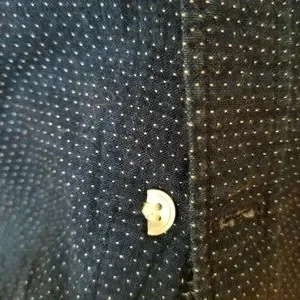 Condition: bottom button is cracked and right front hem has a flaw (see photos; not visible when shirt is tucked in)