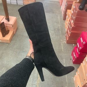 Knee High Block Heel Boots in Black Faux Suede, Women’s