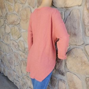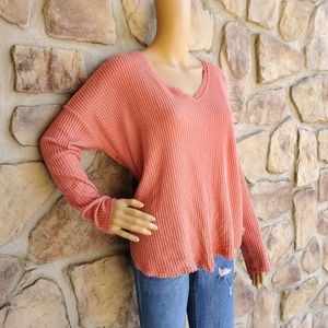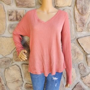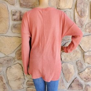 ❤️Item: Long sleeve; Peach/Pink/Salmon color; V-neck; Waffle Knit; Light Weight Material; Middle seam down middle of back; loose fitting
