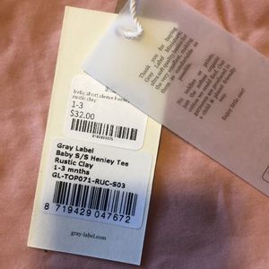 Brand new with tags Gray Label organic short sleeve henley in rustic clay (peachy color). Gray label size is 1-3 months - it is a boxy fit. So soft! Like fin & Vince, Rylee and Cru, etc.