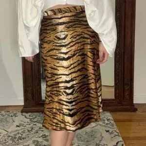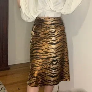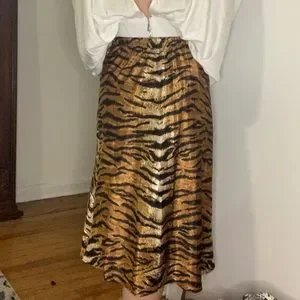 Haute Monde Tiger Animal Print Midi Slip Skirt. Elastic waist. Silky texture. Midi length. 100% Polyester.
