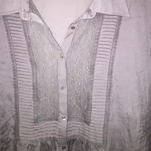 Beautiful muted grey blouse with tie up sleeves, sheer lace placket on chest with ribbon trim. Mother of pearl look buttons. Size 18/20. Bust 23" across flat. 26" long. Gently used in excellent condition. 100% polyester.