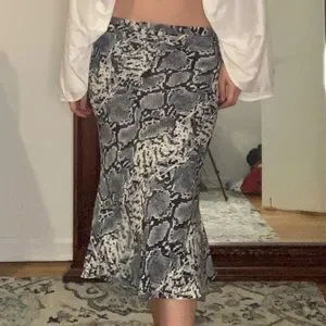 Midi length snake print skirt with a flared hem. This on-trend piece is best styled with a white or black tube top and some platform sneakers. Animal Print Hi-Rise Midi Skirt Model is 5'8 and wearing a size Small