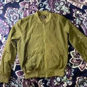 Green bomber jacket. Wrinkled from storage. Reminds me of the jacket Mathilda wears from Leon the Professional. Cute arm zipper details.