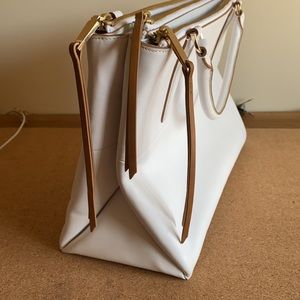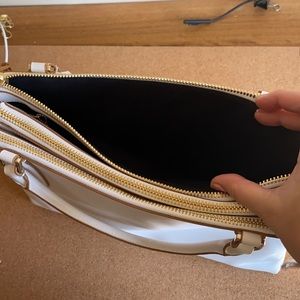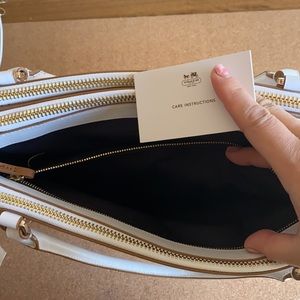 Rare coach bag with removable strap in pristine condition. A very small flaw- see last photo. Lots of storage with three bigger zipped compartments and an inner zippered pocket as well with storage in between the three zipped sections. Each zipper has tassels. Gold hardware. Barely used and really beautiful.