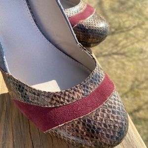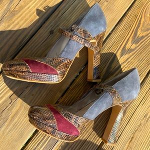 Hinge High Heel Snakeskin Suede Shoes in a Size 9.5. 70s style. They are Baltic Lea style. Sold at Nordstrom originally $115. New with tags but without box.