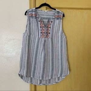 This linen-cotton blend tank has gray and taupe stripes and lovely traditional style folk embroidery on the front yoke and shoulders. No stretch but has darts. Good pre-owned condition. Size large