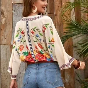 Very elegant and fashionable Multicolor boho Floral Pattern V neck Long Batwing Sleeve Regular Fit Non-Stretch Polyester Material Machine wash or professional dry clean