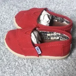 Gently used red Tom’s shoes. Toddler size 6 (hard to get a picture of the tag inside!) Some mild fading on toes see pictures. Velcro openings for ease. Mark on bottom black out kid initials