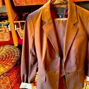 Chocolate brown suit from the limited size 6 jacket and pant with cream with brown striped lining- drew fit- mid waist, slightly boot cut. Sleeve in pic- is most reflective of the color. More dark brown than a warmer brown. First picture had a lot of light exposure.