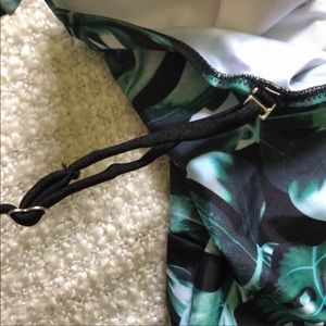 Brand new tropical one piece swim suit. Suit has deep v neck plunge with black criss cross across front. Straps are adjustable and detach in back. Suit has padded cups. No smoking home.