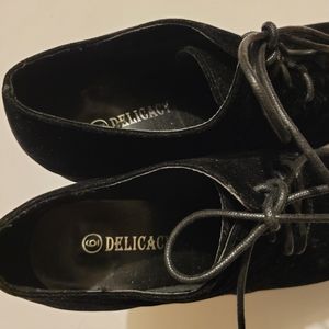 New Delicacy Platform Black Suade Wedge Heels. Lace up top. New condition and from my aunt's shoe collection.