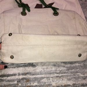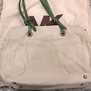📣LAST CALL / MAKE AN OFFER: Closet clean out! Michale Kors med to large canvas with 💯 leather trim detail, bag. Makes a great catch all or office bag- will hold a laptop. I used many about twice as a carry on. Inside zipper compartments help keep you organized and in style. Classic bag. Had had for years, only used very few times, just never reach for it. Comes with original dustbag. Very good condition with no noticeable wear on the corners. Please review pics for minor wear bc it’s an off-white. No rips or tears. Straps are perfect. Inside excellent. Dust bag just washed. Make an offer!