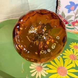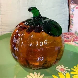 Pretty vintage art glass pumpkin. Rich orange and green blown glass with semi molded leaf. Some bubbles and small irregularities add to its charm. A nice addition to your art glass collection