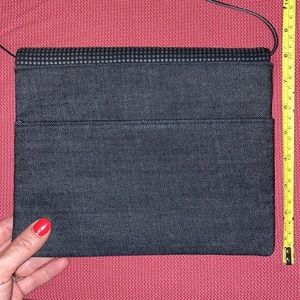 In great condition. No rips. No stains. No scratches. It is a dark grey jean-like material with a textured polka dot flap. Questions? Leave a comment below!
