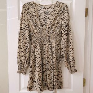 This flirty dress features a flattering ruched waist, v-neckline, long lantern style sleeves and a trendy cheetah print pattern.