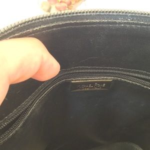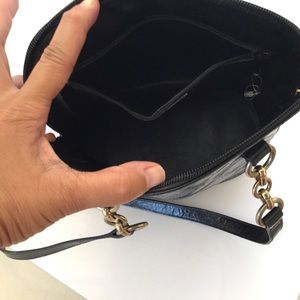 Beautifully embossed with horse and harness design on front. Features a mix of black and dark brown hues, golden brass hardware at straps and zipper side pocket inside.