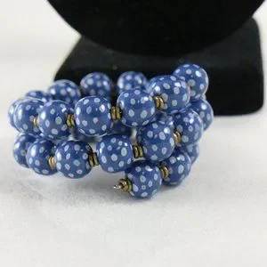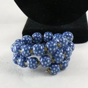 This is a beautiful set of all handmade beaded jewelry made in Kenya. The beads are earthen clay painted by hand and all pieces fully assembled by hand as well. No piece is the same and every bead has its own unique features. The set consists of a set of dangle earrings, an 18 inch necklace and coil bracelet that easily wraps around the wrist. No issues anywhere. All brand new and authentic.