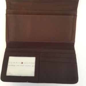 TOMMY HILFIGER: Brown and tan monogram wallet. Has a snap closure. Has three openings inside for bills and receipts the bottom part has a slot for your ID and three credit cards. Has never been used or carried and has no stains in excellent condition.