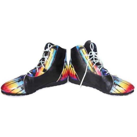 AMAZING black leather lace up ankle boots! Painted by "Simon" probably in the 80's. The insole has been removed so I have no idea who made these shoes but the leather is soft and supple.