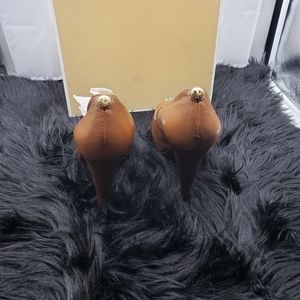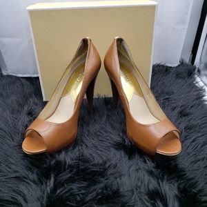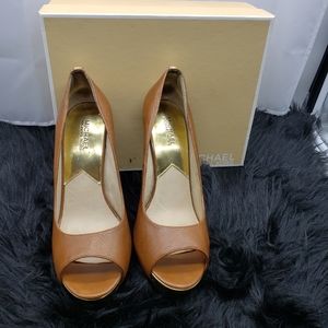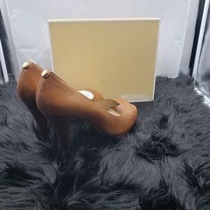 Michael Kors Cognac Colored Leather Platform, Gold Trim 5' Heels. A Stiletto Heel Open Toe Shoe.