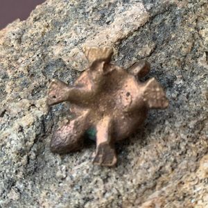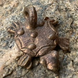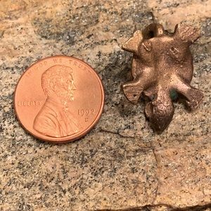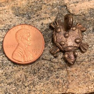 Metal, copper color but could be copper color over brass. Not sure of what kind of metal it is. But it’s so cute! Does not come with a chain. About the size of a penny (see pictures).