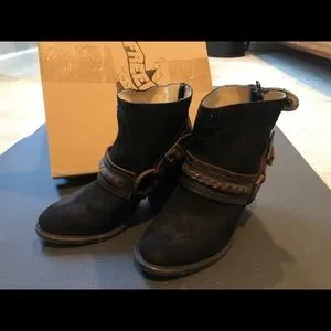 Incredible Freebird booties, black suede with leather and chain harness, wood heel. I’m crazy for them, but they’re just too big for me. Never worn.