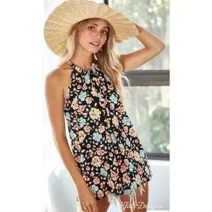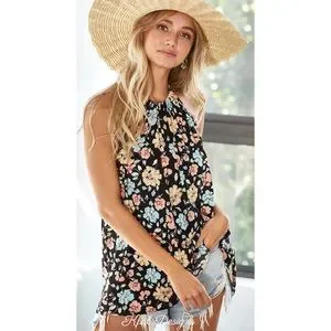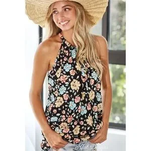 ❤️NEW! Floral Print Black Woven Back Tie Halter Top!