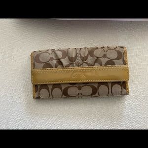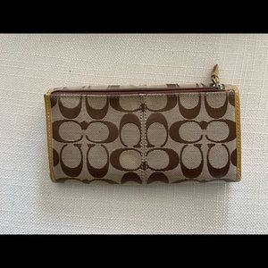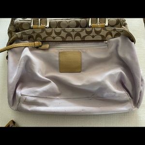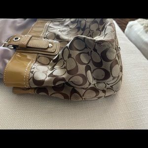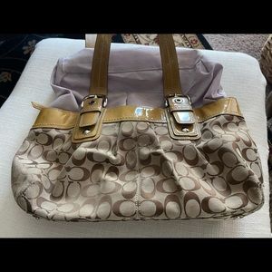 Coach beige, signature, soho, pleated, jacquard, bag/purse and matching wallet.