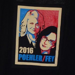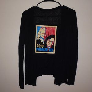 This cardigan has a graphic of Amy Poehler and Tina Fey stitched onto the back.